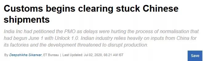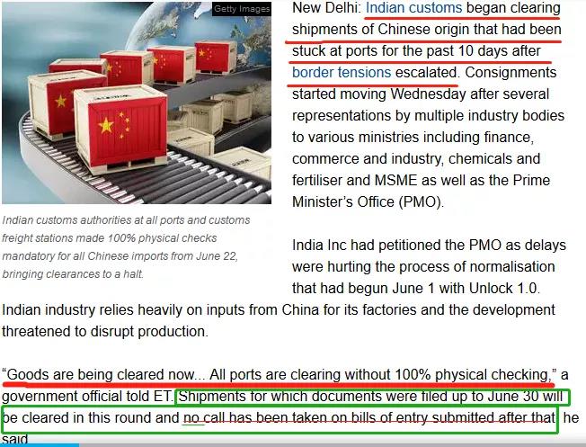 新德里、钦奈和孟买的海关经纪人协会的官员证实了这一进展。然而,一名了解事态发展的人士表示,周三(7月1日)开始,美国和韩国企业的进口许可仍将继续。官员们表示,已向海关当局提供了一份未经海关查验即可通关的公司名单。从6月22日起,印度所有港口和海关货运站的海关当局对所有从中国进口的货物进行了100%的强制检查,暂停了通关。尽管官方没有发出这方面的指示,但当局表示,正在根据有关情报警报进行检查。当时查验从钦奈开始,并很快蔓延到其它港口。除了医疗设备和汽车零部件,钦奈接收了大量进入印度的中国电子设备。